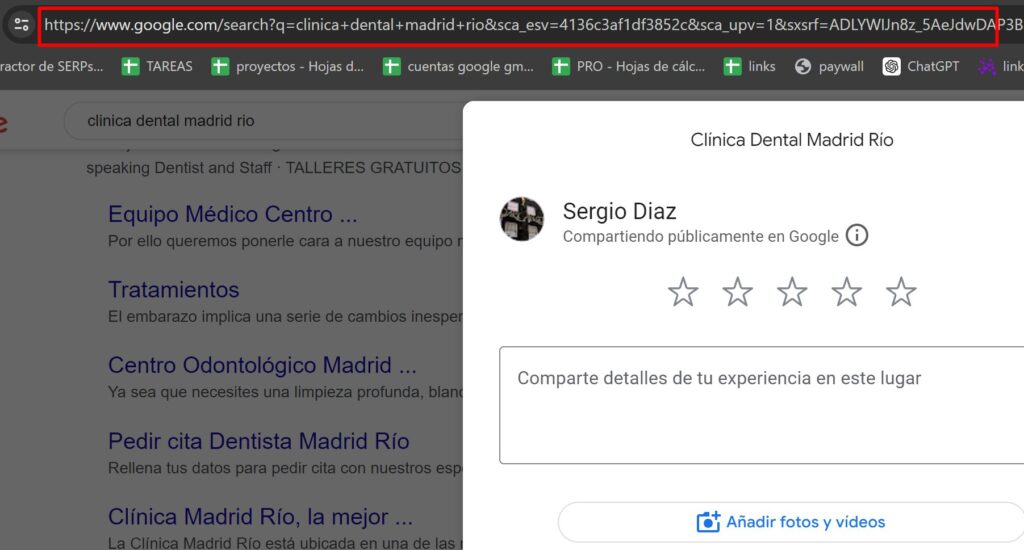 - Busca tu Negocio en Google: Busca en Google tu negocio y haz clic en el bookmarlet que has añadido anteriormente.