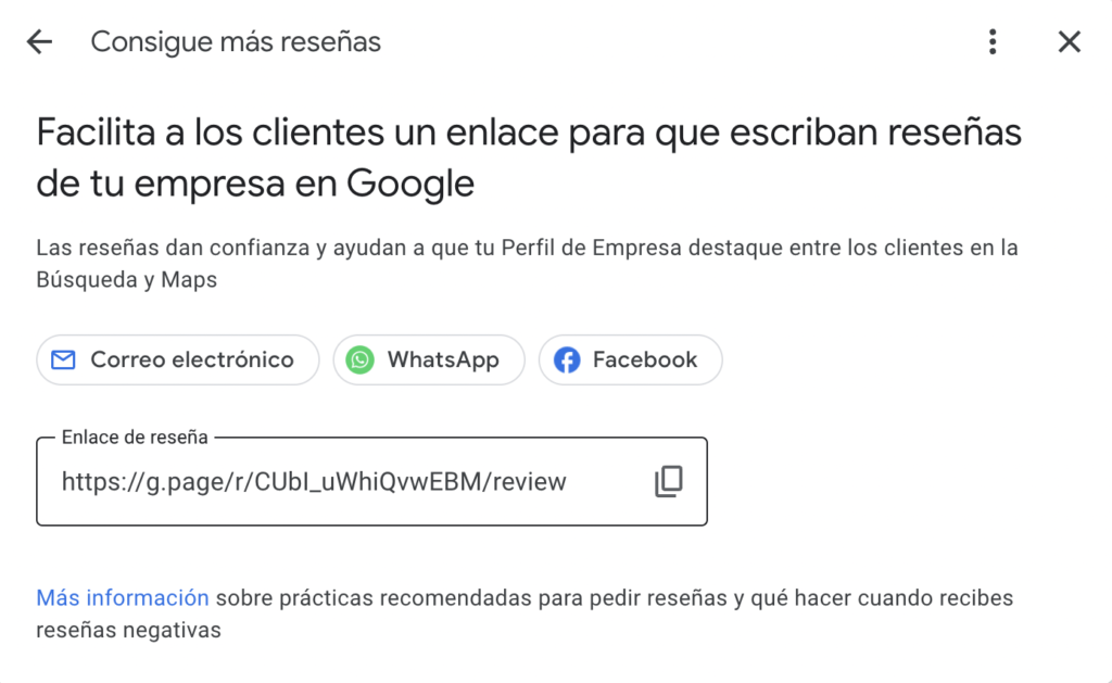 Esto generará una URL corta, el «Enlace de reseña», que puedes copiar y compartir con tus clientes.