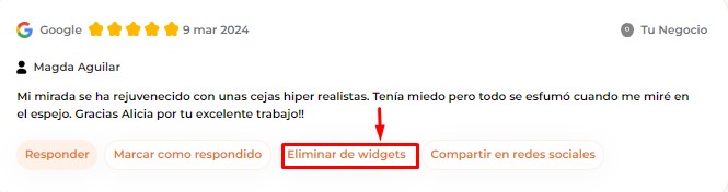 ¿Quieres excluir una reseña de los widgets? Sección Reseñas y clic en «Eliminar de widgets».