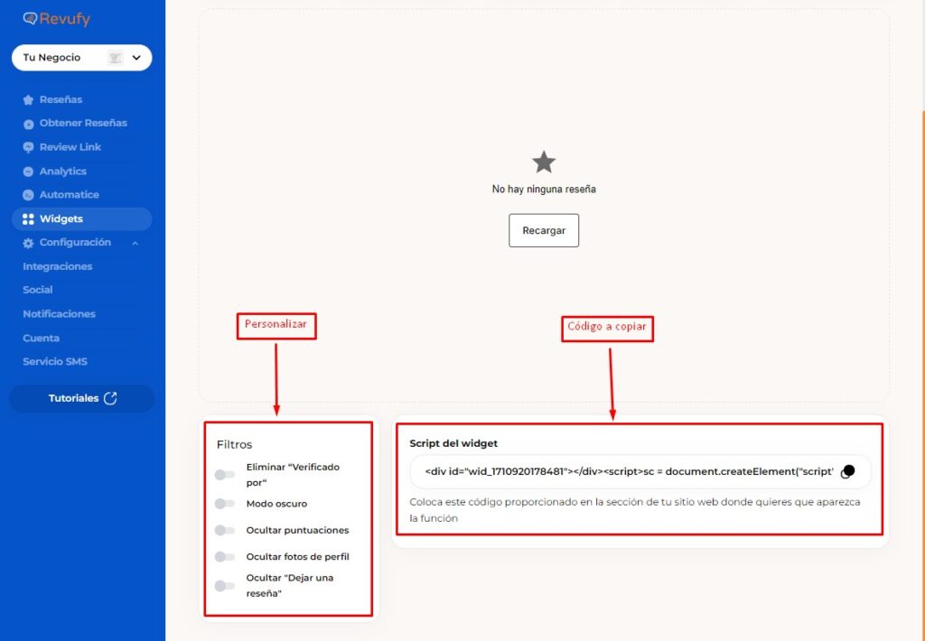 Los widgets muestran exclusivamente reseñas de 4 y 5 estrellas con texto. La aplicación genera un código automáticamente para una integración sencilla en tu sitio web como un elemento HTML.
