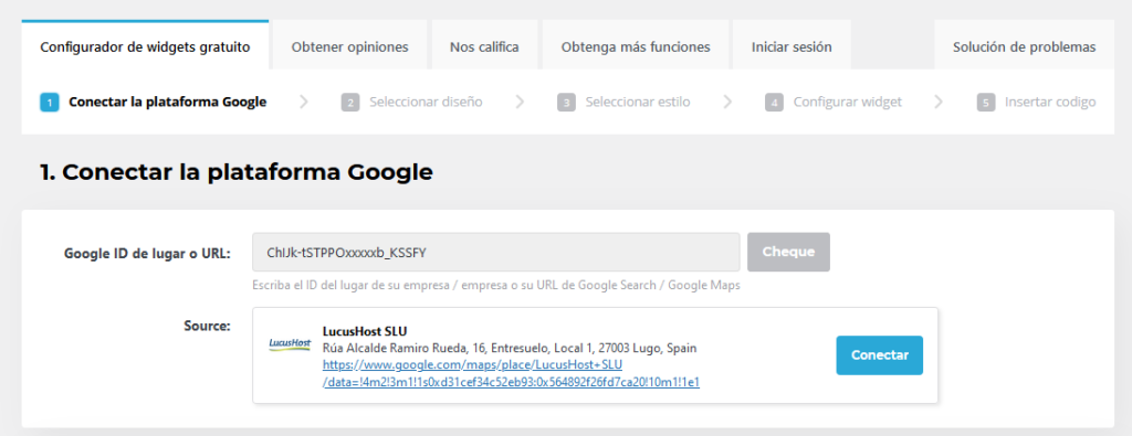 - Paso 3: Configurar el plugin widget: debemos dirigirnos al editor del plugin y nos encontramos con “Conectar la plataforma Google”. Aquí debes pegar tu código y hacer clic en “Cheque”, y a continuación en “Conectar”.