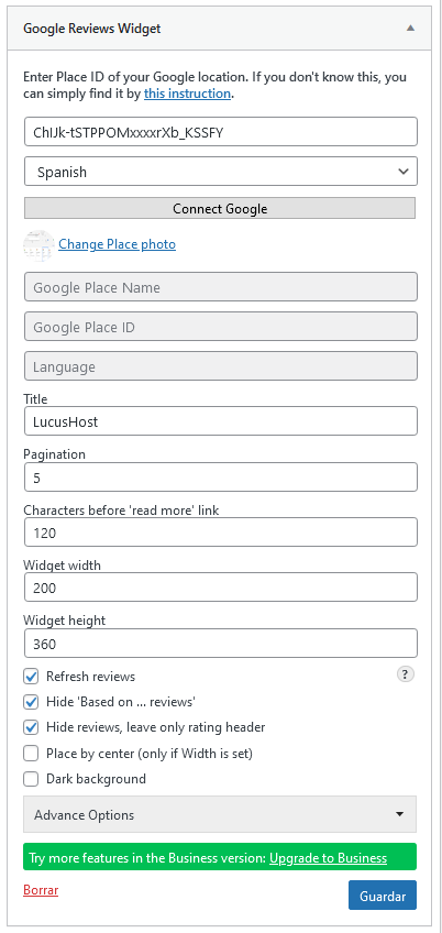 - Paso 5: Añade ahora información de tu negocio, y puedes personalizarlo. Es obligatorio rellenar el Place ID de tu negocio (el mismo que te explicamos en la primera opción). Con el identificador que has obtenido, vuelve a la configuración del widget, completa la info y clic en «Guardar».