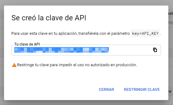 Volvemos a Google APIS: “Credenciales” y clic en “Crear clave API”.