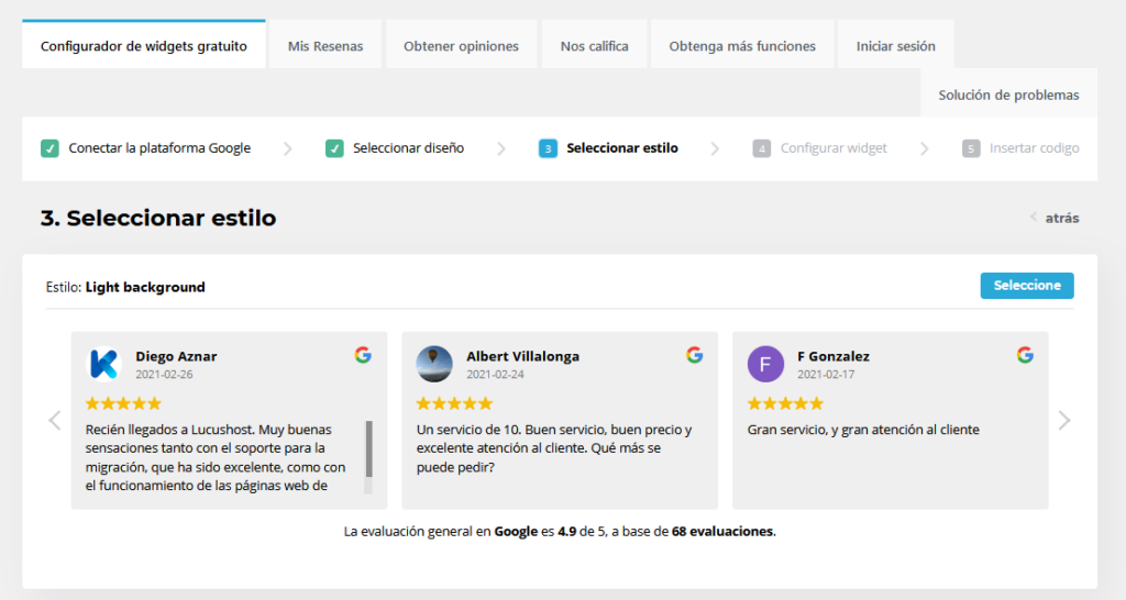 En Seleccionar Diseño se nos permite escoger la forma en que los usuarios verán las reseñas de Google.