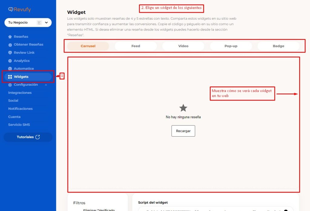Tienes varias opciones para elegir entre los widgets: Carrusel, Feed, Video, Pop-up o Badge, ya depende de tus gustos.
