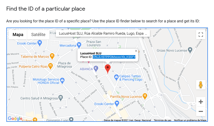 - Paso 2: Buscarnos en Google Maps. Al buscar nuestro negocio en Google Maps, nos aparecerá el Place ID, que no es más que un código identificador, y lo copiamos.