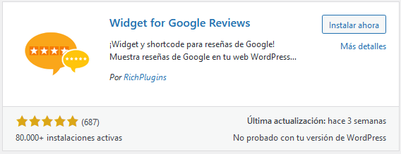 - Paso 1: Instala el plugin. En el caso de WordPress lo tienes bastante fácil, con solo escribir en la sección de plugin “Widgets para reseñas de Google”, lo descargas, lo instalas y, una vez activado, ya lo puedes usar.