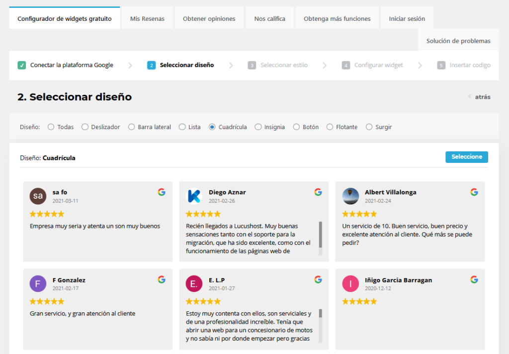 En Seleccionar Diseño se nos permite escoger la forma en que los usuarios verán las reseñas de Google.